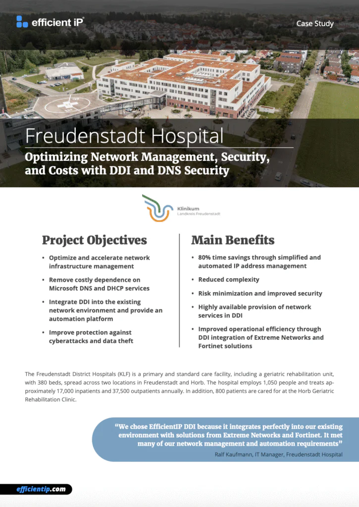 SmartArchitecture™ Secure, Resilient and Automated DNS & DHCP Management Intelligently simplify and automate design, deployment and management of mission-critical DNS & DHCP servers Read as PDF The deployment of DNS and DHCP services is complex. It requires strong expertise to correctly configure each individual DNS or DHCP server within a specific architecture. Any configuration errors will impact not only network availability but potentially also enterprise security. EfficientIP SmartArchitecture™ intelligently simplifies and automates design, deployment and management of mission-critical DNS & DHCP servers, ensuring: Template-based secure and reliable architecture designs Intelligent policy-driven automation for best practices enforcement Unified management for comprehensive control of your DNS-DHCP infrastructure across on-prem and cloud networks. SmartArchitecture is compatible with EfficientIP’s SOLIDserver DNS & DHCP appliances, Microsoft® Windows DNS-DHCP servers, AWS Route 53 and Azure DNS Zones DNS Services and open source servers (ISC BIND and ISC DHCP), offering a smooth integration with existing network services. Secure Design and Automated Deployment of DNS & DHCP Architectures Simplify design and setup phase of your critical network services with a rich library of state-of-the-art, policy-driven templates of DNS & DHCP architectures: DNS Primary-Secondary, Multi-master DNS, Stealth DNS, DNS load sharing DHCP cluster, DHCP failover one-to-one, DHCP one-to-many (DHCP Star failover) Apply automatically specific security best practices and ensure error-free setup configuration for fast and reliable deployments of your core network foundations. Request A Demo See SmartArchitecture in action with a demo of the SOLIDserver DDI suite for critical DNS-DHCP-IPAM services. Get Started Advanced Management Automation of DNS & DHCP Services Collapse Manage all servers within a SmartArchitecture as a single entity and eliminate configuration errors. Centrally manage and unify management of deployed SmartArchitectures through a single-pane-of-glass, for on-prem, hybrid-cloud and multi-cloud environments. Get comprehensive visibility of multi-vendor DNS-DHCP services with reports and dashboards. Carrier-Class High Availability Active-Active DNS and DHCP Failover Expand Ensure network services availability with highly resilient SmartArchitecture. Automated active-active failover mechanisms deliver immediate swap in case of server failure, transparently to business operations. Innovative designs such as DHCP Star failover and hybrid Cloud DNS redundancy deliver an unprecedented level of resiliency while simplifying your network and decreasing operating costs. Built-In Multi-Vendor DNS and DHCP Disaster Recovery Expand Implement unified multi-vendor DNS and DHCP disaster recovery plans in distributed network environments. Restore in just a few steps the configuration of a crashed server to its original state, the way it was right before the crash, without any loss of data. Integrated IP Address Management With SmartArchitecture DNS-DHCP Expand Unify management of DNS-DHCP services with IP plans from one consistent GUI providing a comprehensive and real-time view of the entire address space deployed over multiple networks. Simplify delegation of complex tasks through wizard-driven and error-free deployments, and keep track of all changes. Key Resources Discover more content related to SmartArchitecture Webinars What Your DNS is Trying to Tell You: Reveal Risk in Traffic Explore Case Studies Freudenstadt Hospital: Optimizing Network Management, Security, and Costs with DDI and DNS Security Explore News New 2025 GigaOm Radar for DDI Explore Reports & Surveys 2025 GigaOm Radar Report for DDI: EfficientIP a Leader Explore Case Studies Alcatel-Lucent Enterprise: Migrating DDI Solution to Optimize Network Costs, Efficiency, and Reliability Explore Videos Unified Asset Discovery Solution – Overview Explore Events Join us at IT & Cybersecurity Meetings España 2025 Explore Reports & Surveys 2025 EMA™ Radar for DDI: EfficientIP Named Value Leader Explore Events Beyond Integration: Powering the Future of Your Network Management at Cisco Connect Canada Explore Events Unlock the Future of Network Management at Cisco Live Melbourne 2025! Explore View All Resources Simplify & Secure Your Network When our goal is to help companies face the challenges of modern infrastructures and digital transformation, actions speak louder than words. Request A Demo