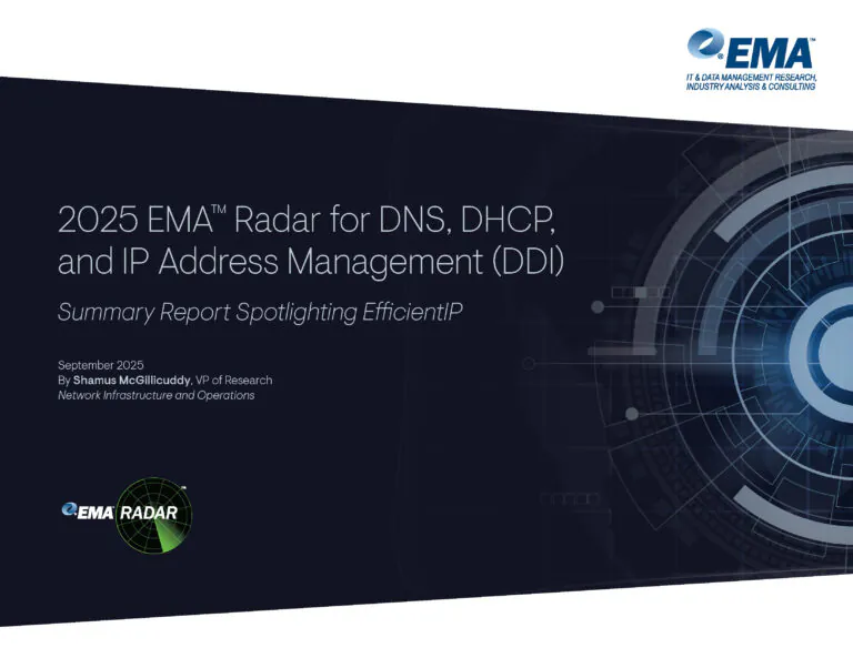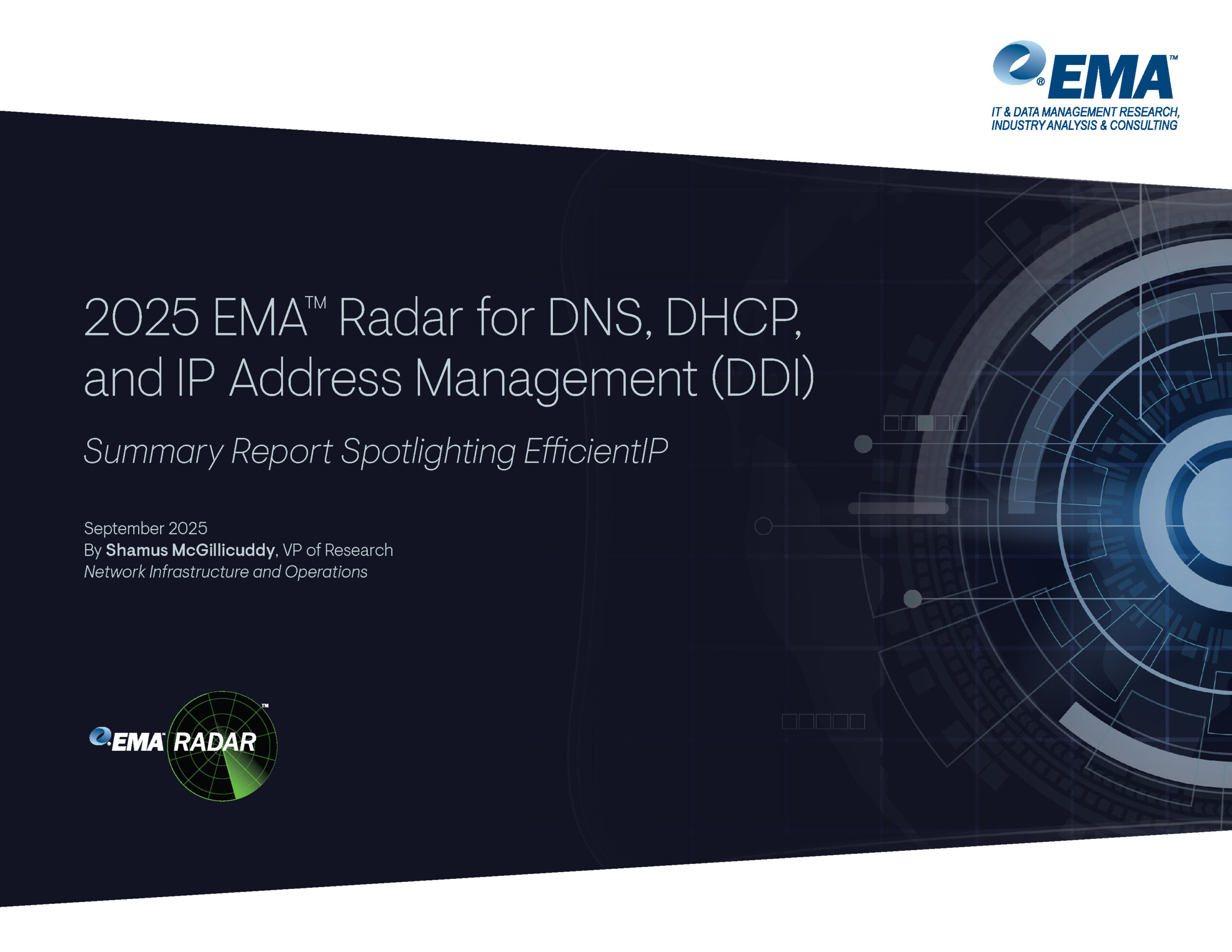 2025 EMAโข Radar for DDI: EfficientIP Named Value LeaderThe 2025 EMA Radar for DDI explains why IT leaders are turning to DDI. It details key considerations when choosing your DDI solution, and ranks DDI vendors according to product strength and cost-efficiency. Learn why EfficientIP is a Value Leader....